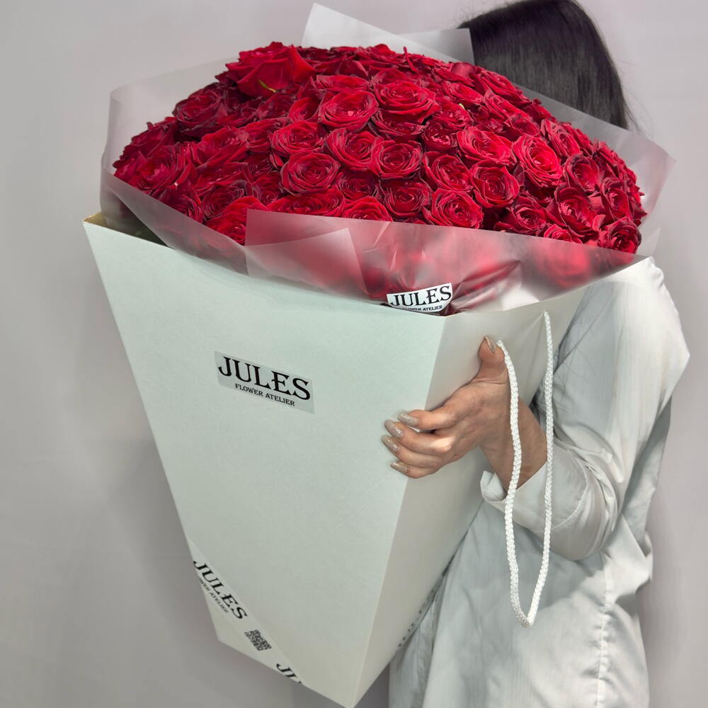 монобукет из красной розы. Глубокий насыщенный оттенок, плотная сборка и ощущение живого ритма - ровного, уверенного, настоящего. Букет оформлен в лаконичную упаковку, выглядит масштабно и собранно. Розы подобраны по тону и форме, создают бархатную поверхность и сильный визуальный акцент. Композиция держит форму и постепенно раскрывается, оставаясь выразительной и цельной. Композиция подойдёт: • для яркого признания • для дня рождения, Дня влюблённых, годовщины • для случая, когда важно впечатление и сила жеста • для тех, кто выбирает классическую выразительность без лишних слов