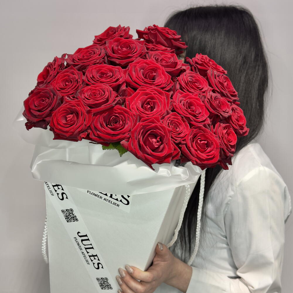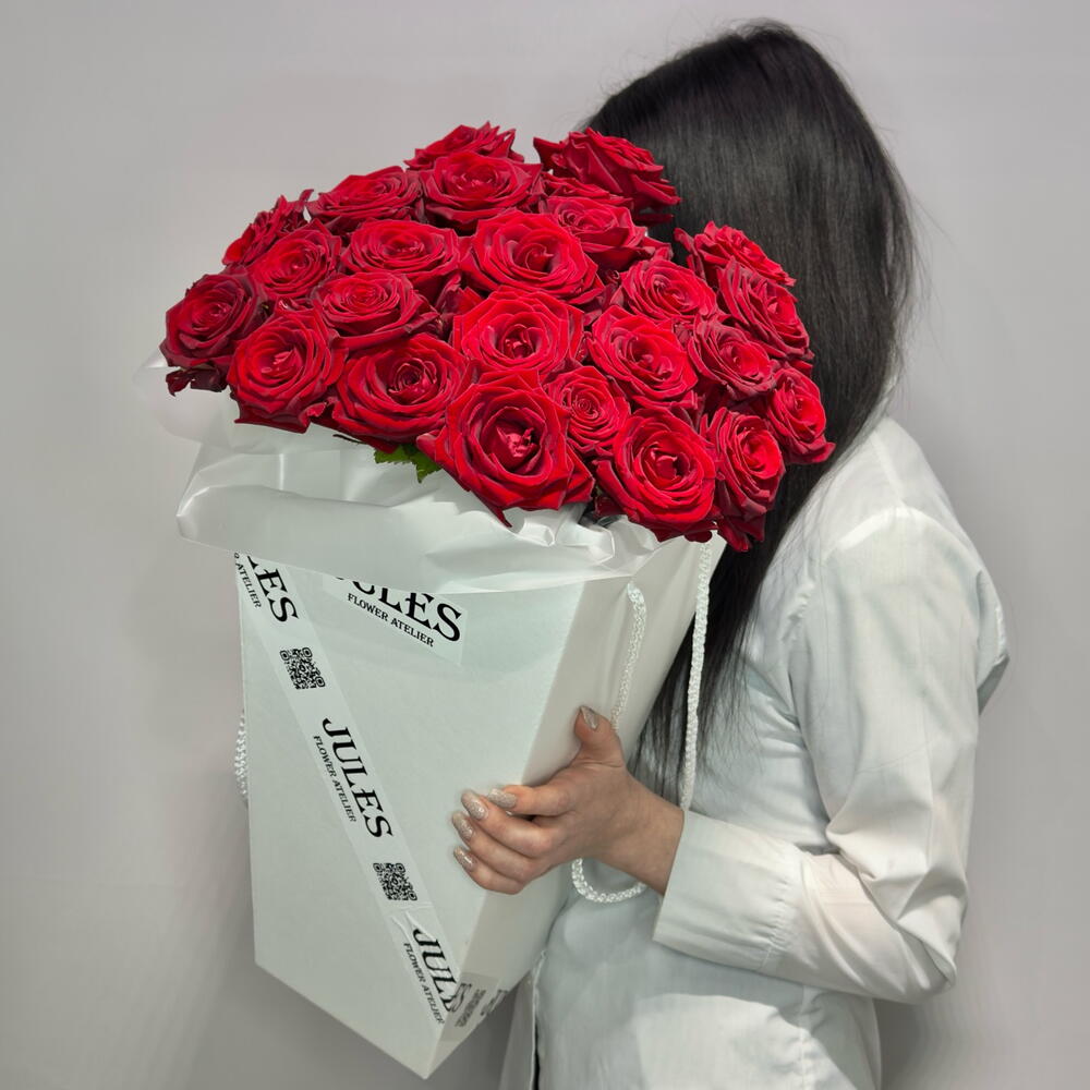 монобукет из красной розы. Глубокий насыщенный оттенок, плотная сборка и ощущение живого ритма - ровного, уверенного, настоящего. Букет оформлен в лаконичную упаковку, выглядит масштабно и собранно. Розы подобраны по тону и форме, создают бархатную поверхность и сильный визуальный акцент. Композиция держит форму и постепенно раскрывается, оставаясь выразительной и цельной. Композиция подойдёт: • для яркого признания • для дня рождения, Дня влюблённых, годовщины • для случая, когда важно впечатление и сила жеста • для тех, кто выбирает классическую выразительность без лишних слов