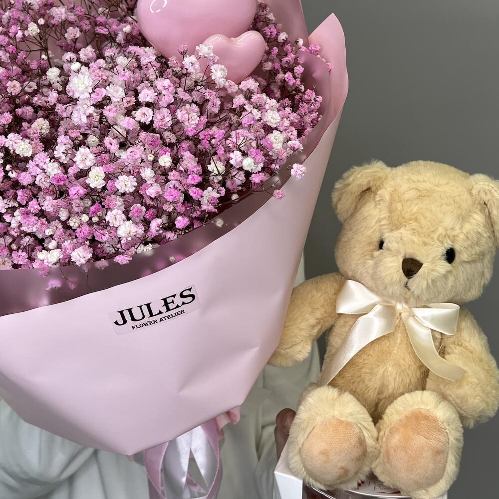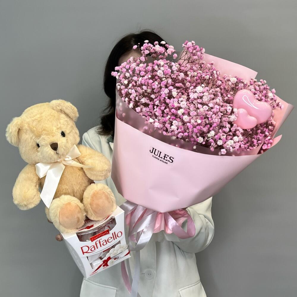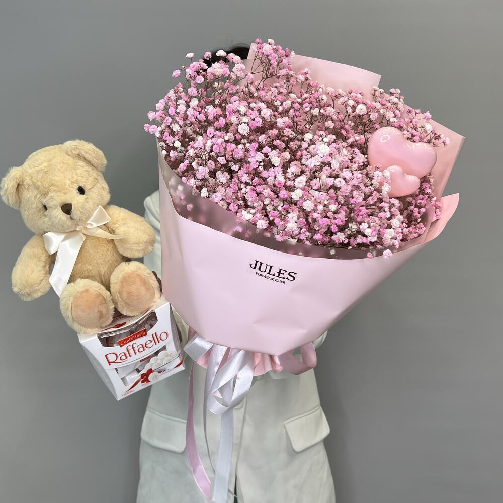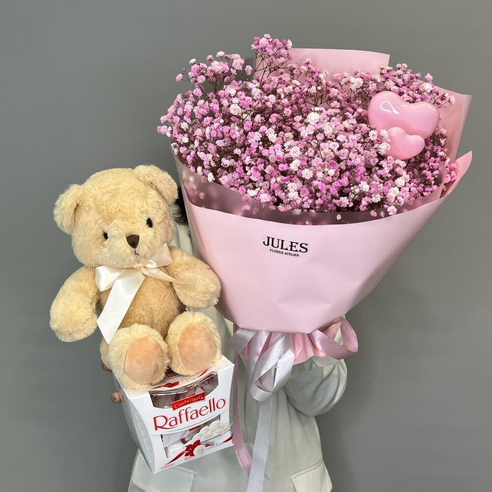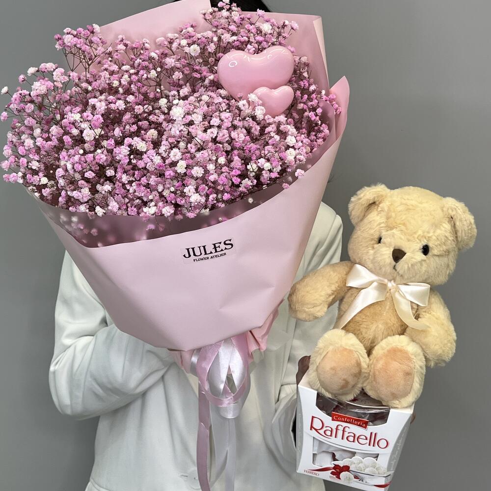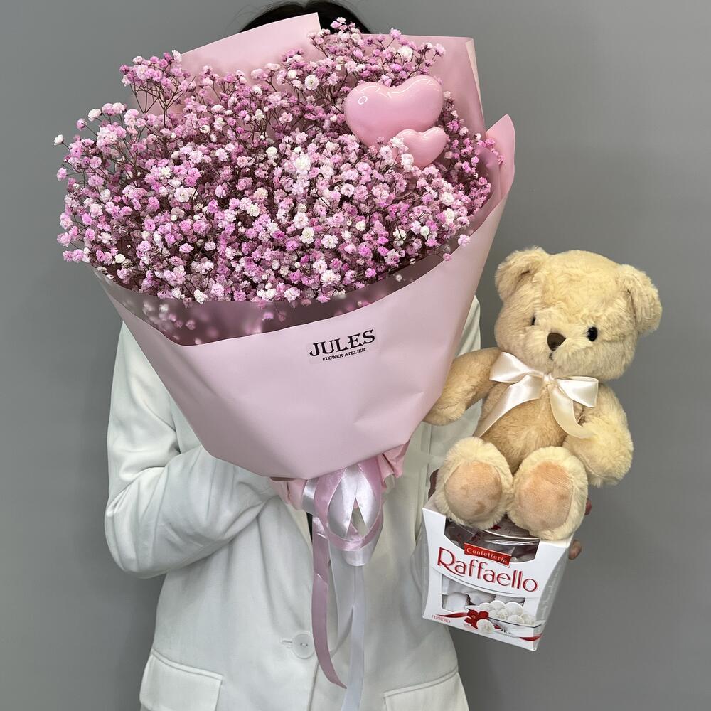 Гипсофила - 7 шт. Раффаэлло - 1 шт. Упаковка дизайнерская - 1 шт. Топпер - 2 шт. Мишка плюшевый - 1 шт.