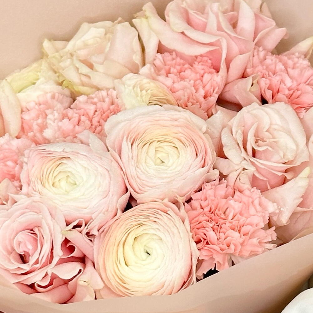 букет из пионовидной розы, ранункулюса и гвоздики. Нежная пудровая палитра, мягкие формы и аккуратная плотность создают ощущение бережности, тепла и спокойной радости. Букет оформлен в матовой упаковке, выглядит воздушно и аккуратно. Пионовидные розы и ранункулюсы формируют объемную, фактурную композицию, гвоздика добавляет стойкость и устойчивость букета. Композиция подойдет: • для девушки, женщины, мамы или подруги • для романтического подарка • для дня рождения, Дня влюбленных, 8 Марта • для знака внимания без повода