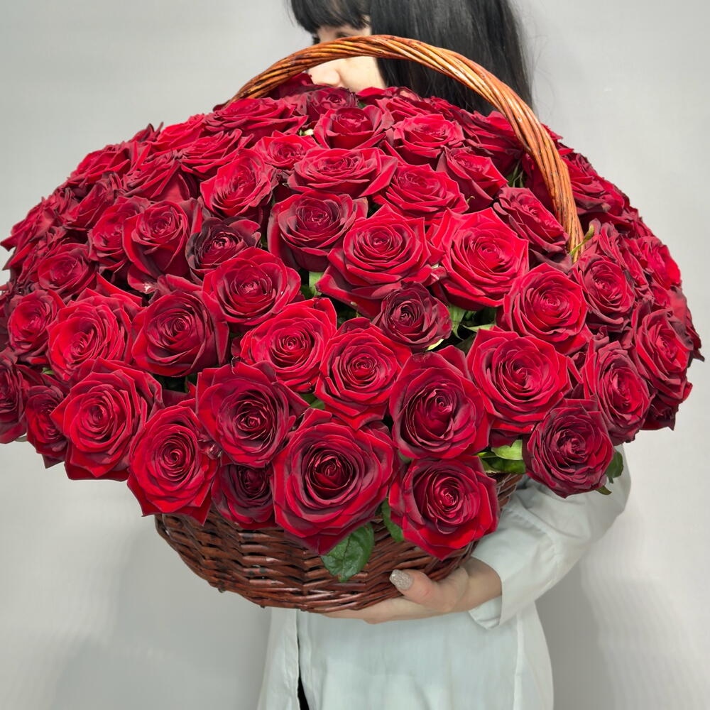 Роза красная - 101 шт. Оазис флористический - 9 шт. корзина плетеная 50 см - 1 шт.