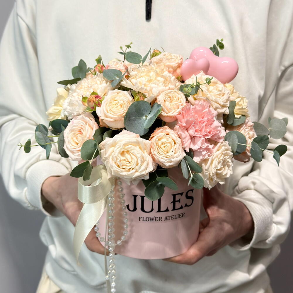 Мадемуазель Коко — композиция из пионовидной розы, гвоздики и эвкалипта. Нежная кремово-пудровая палитра, мягкие фактуры и ощущение утончённой заботы — спокойно, красиво, со вкусом. Букет оформлен в шляпной коробке, не требует вазы и сложного ухода. Пионовидные розы создают плотную, воздушную форму, гвоздика добавляет объём и стойкость, эвкалипт — свежесть и лёгкий акцент. Композиция подойдёт: — для девушки, женщины, мамы или подруги — для романтичного подарка или знака внимания — для тех, кто любит нежные оттенки и классическую элегантность Вы можете заказать цветы с доставкой в Самаре онлайн. Мы используем только свежие цветы и обеспечиваем аккуратную и быструю доставку букетов по Самаре в удобное время.