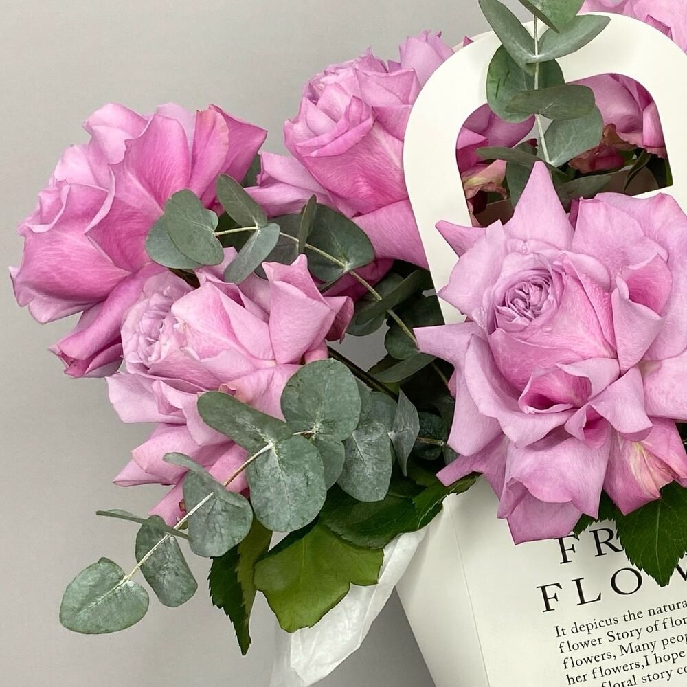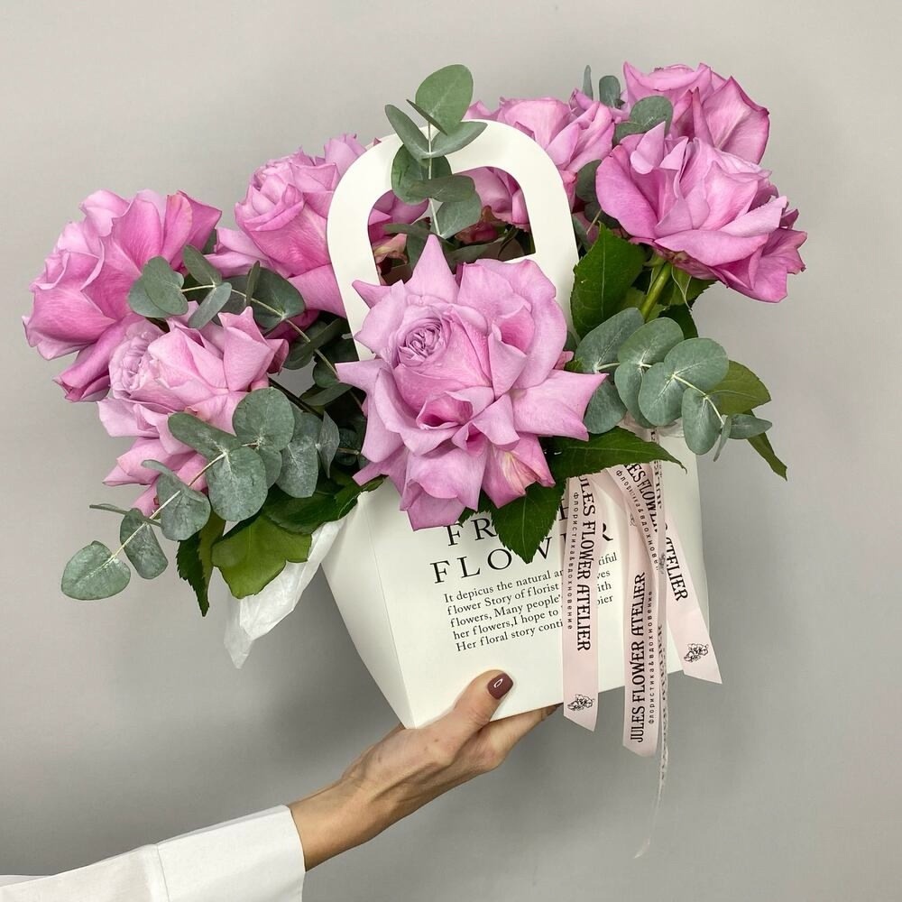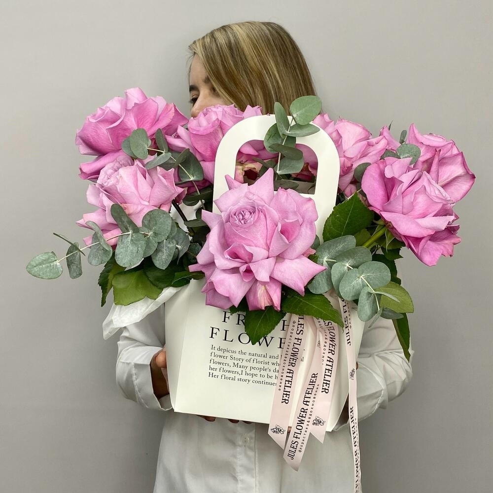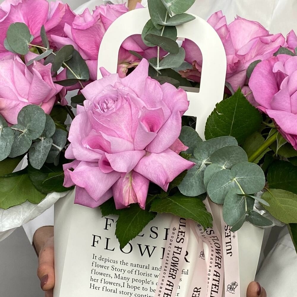 Состав Эвкалипт - 3 шт. Плайм пакет - 1 шт. Оазис флористический - 1 шт. роза квинс краун - 7 шт.