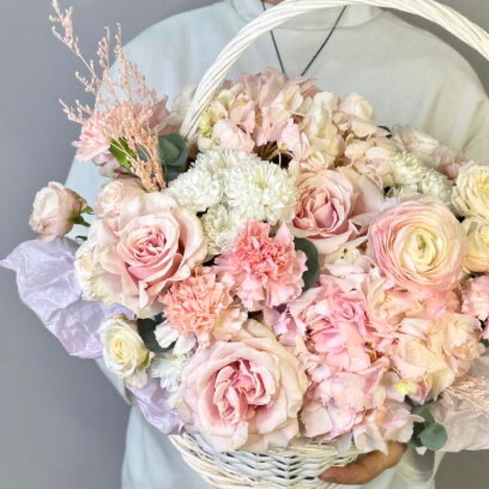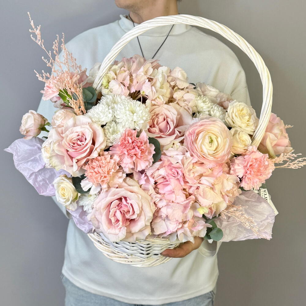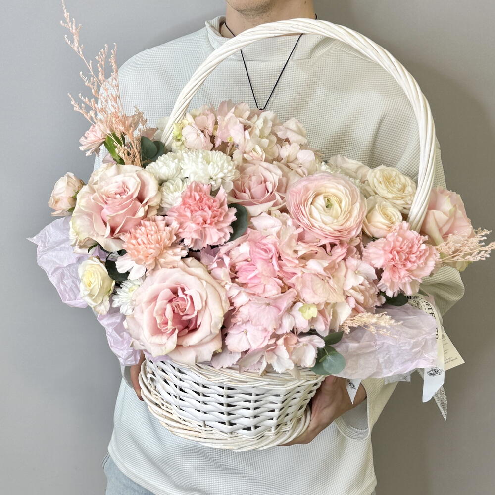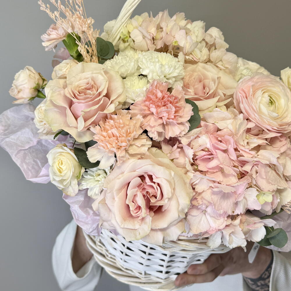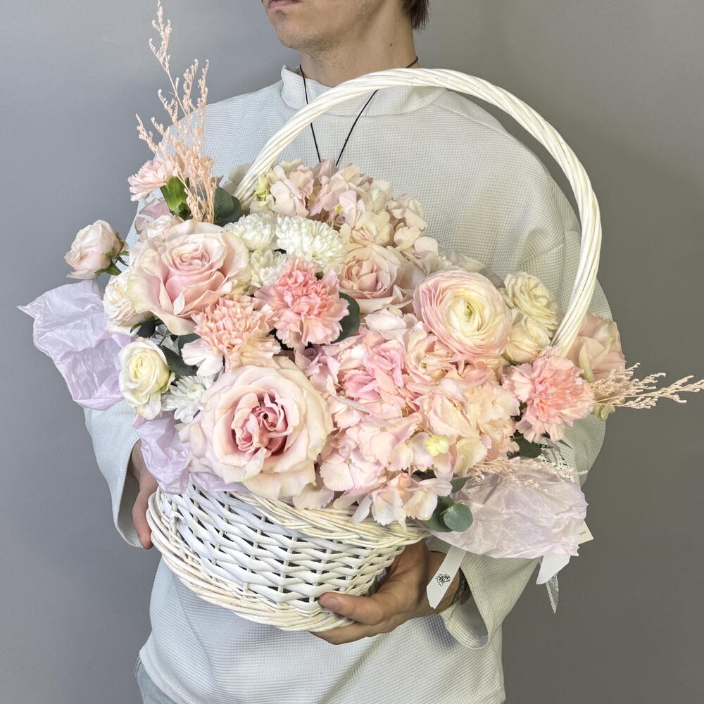 цветочная корзина в светлой пудрово-розовой гамме. Мягкие оттенки, многослойные лепестки и ощущение деликатной закрытости - как лёгкая ткань, через которую проходит свет. Композиция собрана из пионовидной розы, гортензии, ранункулюса и гвоздики. Корзина выглядит объёмно и воздушно, без жёсткой формы, с ощущением живого, неторопливого движения. Гортензия создаёт пышность, пионовидные розы и ранункулюсы дают мягкую фактуру, гвоздика добавляет стойкость и баланс. Композиция подойдёт: • для особенного подарка • для дня рождения, Дня влюблённых, 8 Марта • для торжественного и одновременно нежного повода • для тех, кто ценит светлую, утончённую флористику Вы можете заказать цветы с доставкой в Самаре онлайн. Мы используем только свежие цветы и обеспечиваем аккуратную и быструю доставку по Самаре в удобное время.