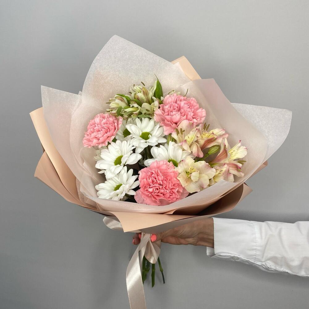 Хризантема кустовая - 1 шт. Диантус - 3 шт. Упаковка дизайнерская - 1 шт.