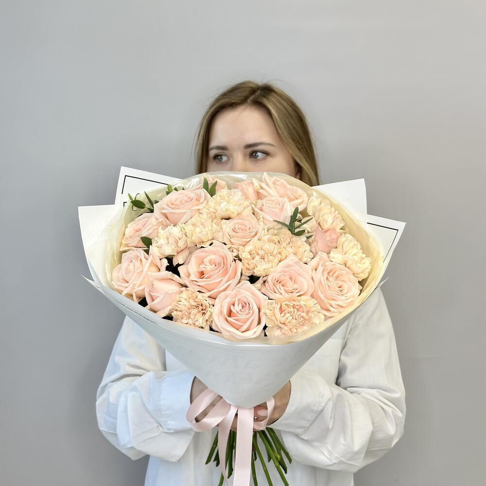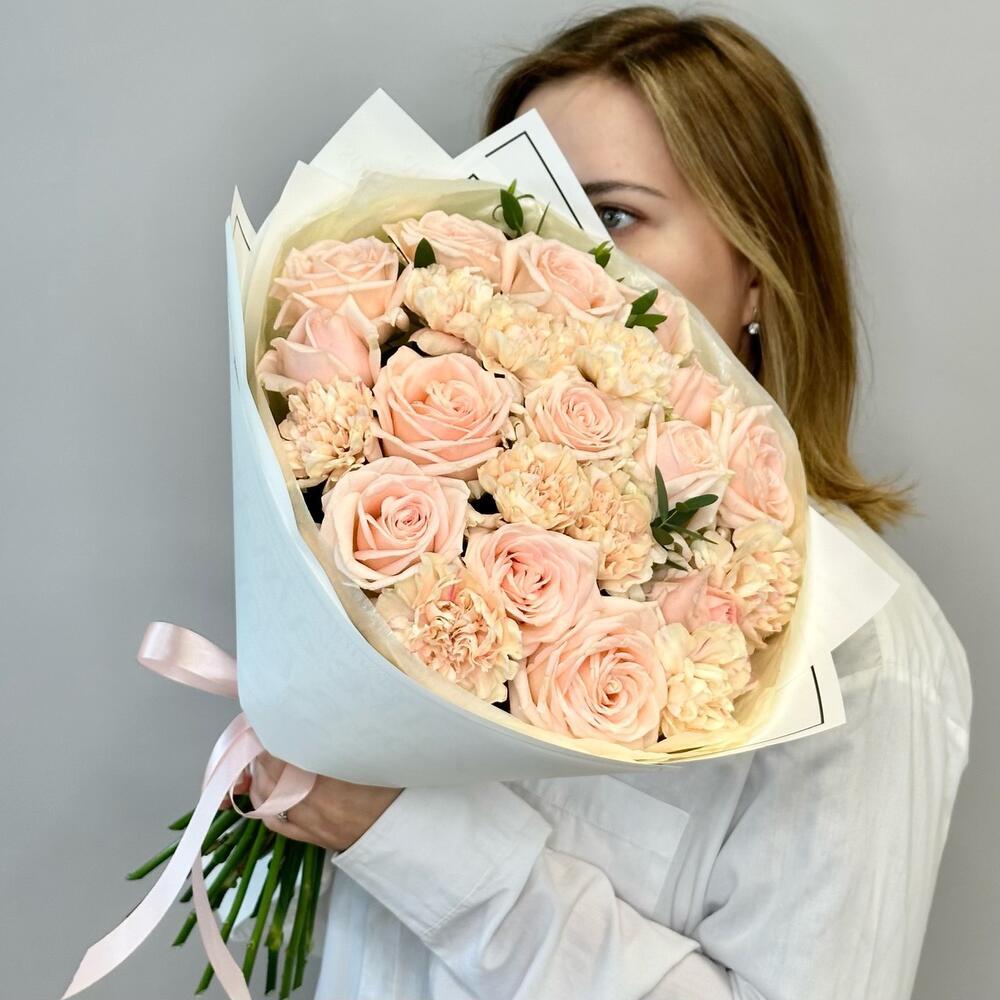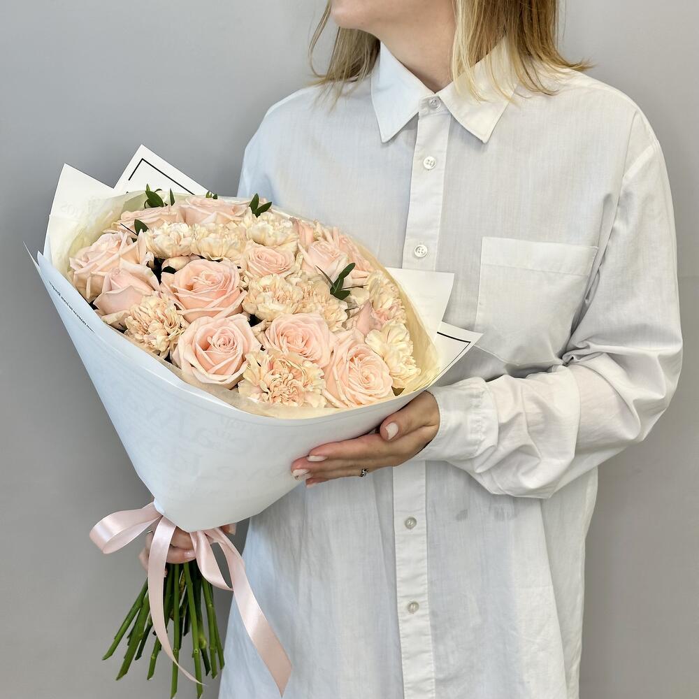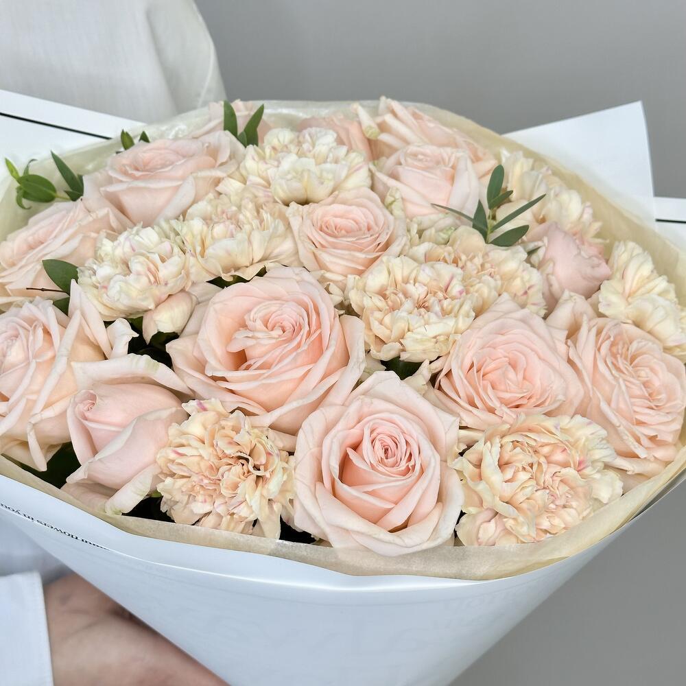 Диантус - 9 шт. Упаковка дизайнерская - 1 шт. роза кимберли - 14 шт.