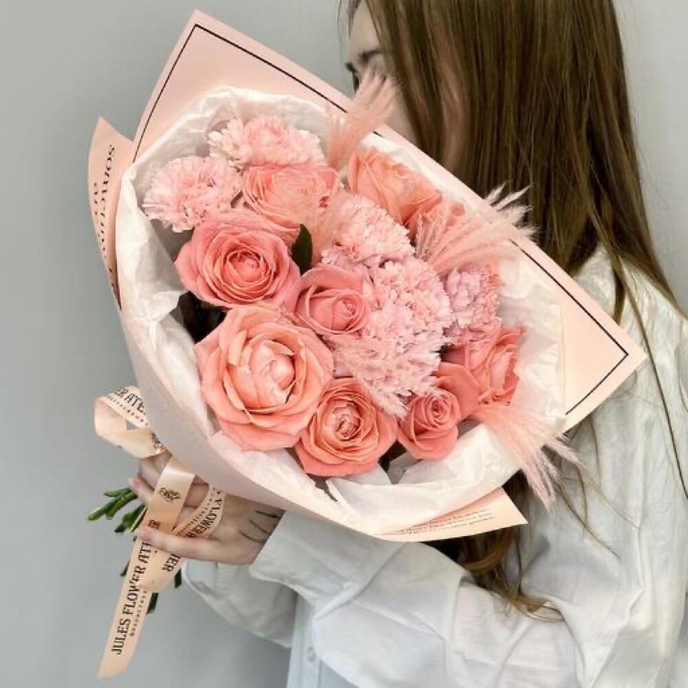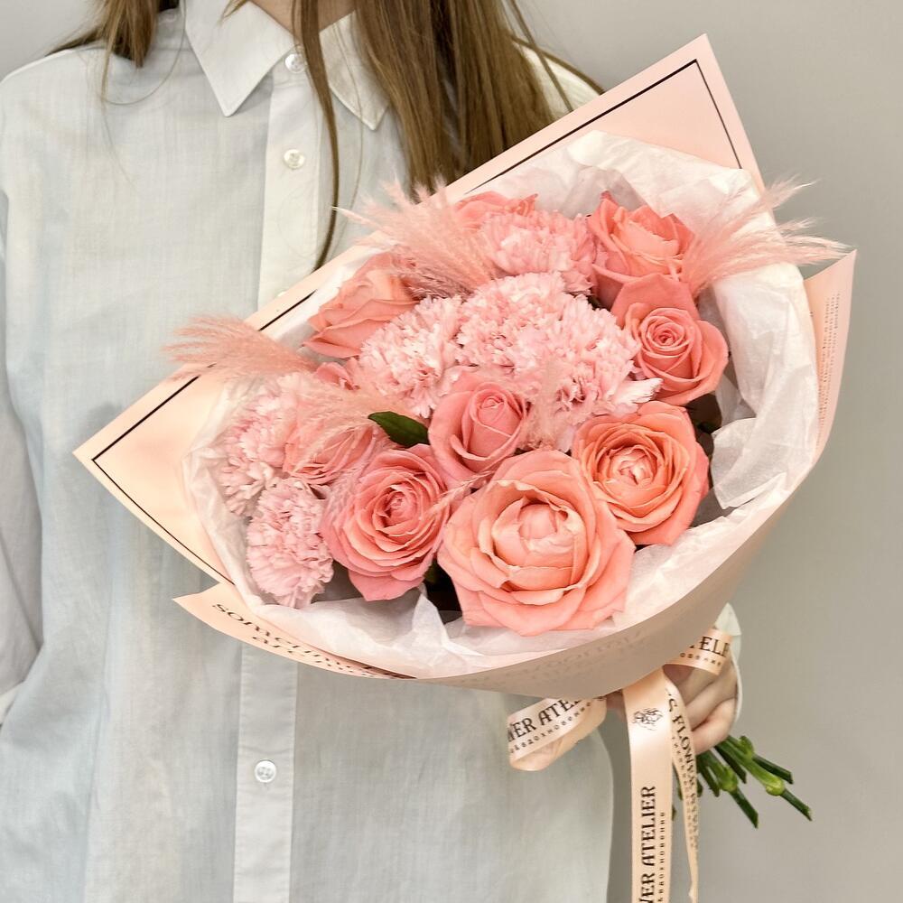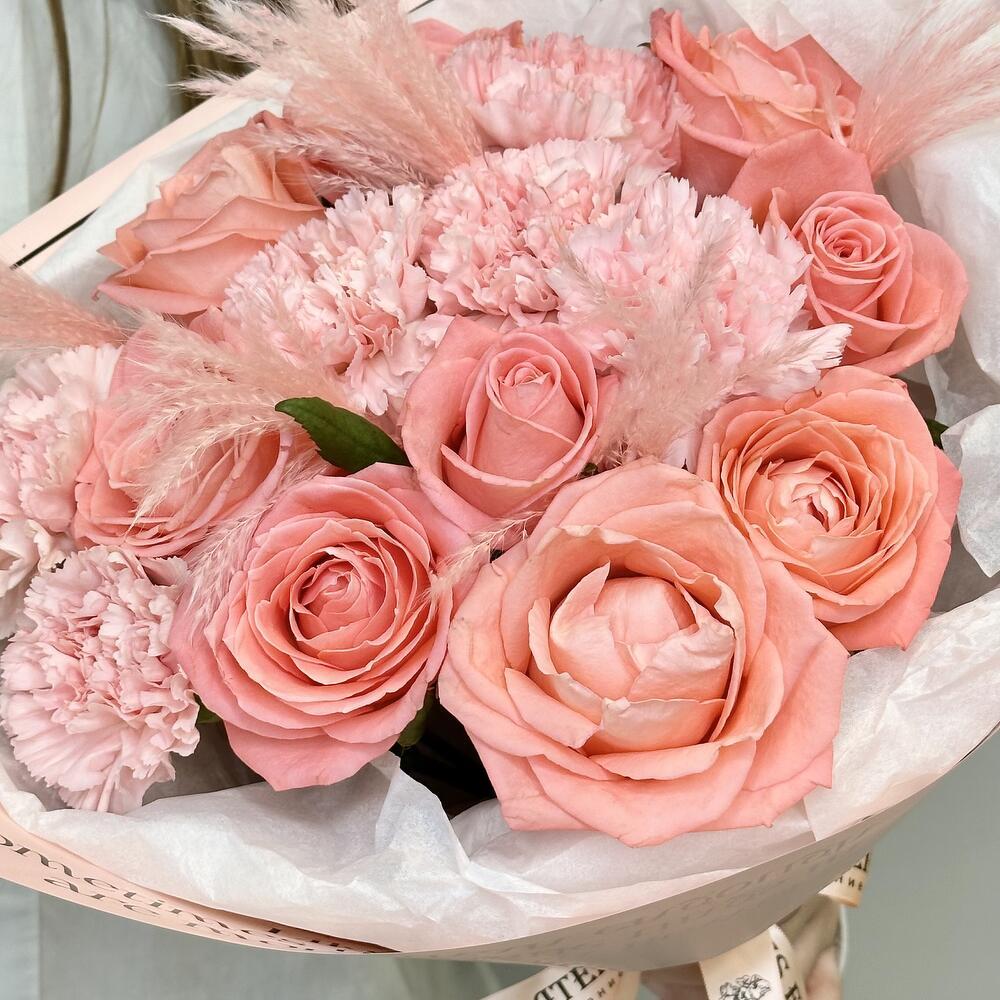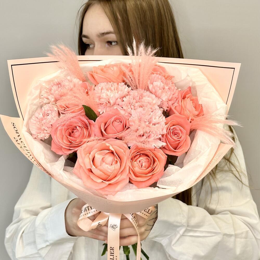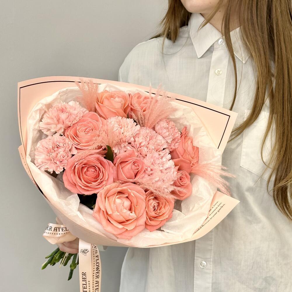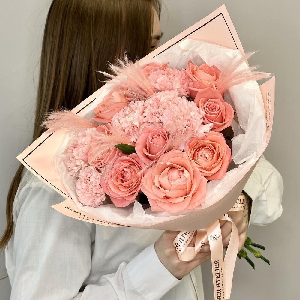 Упаковка дизайнерская - 1 шт. Роза анна карина - 9 шт. Диантус розовый - 6 шт. сухоцвет камыш розовый - 5 шт.