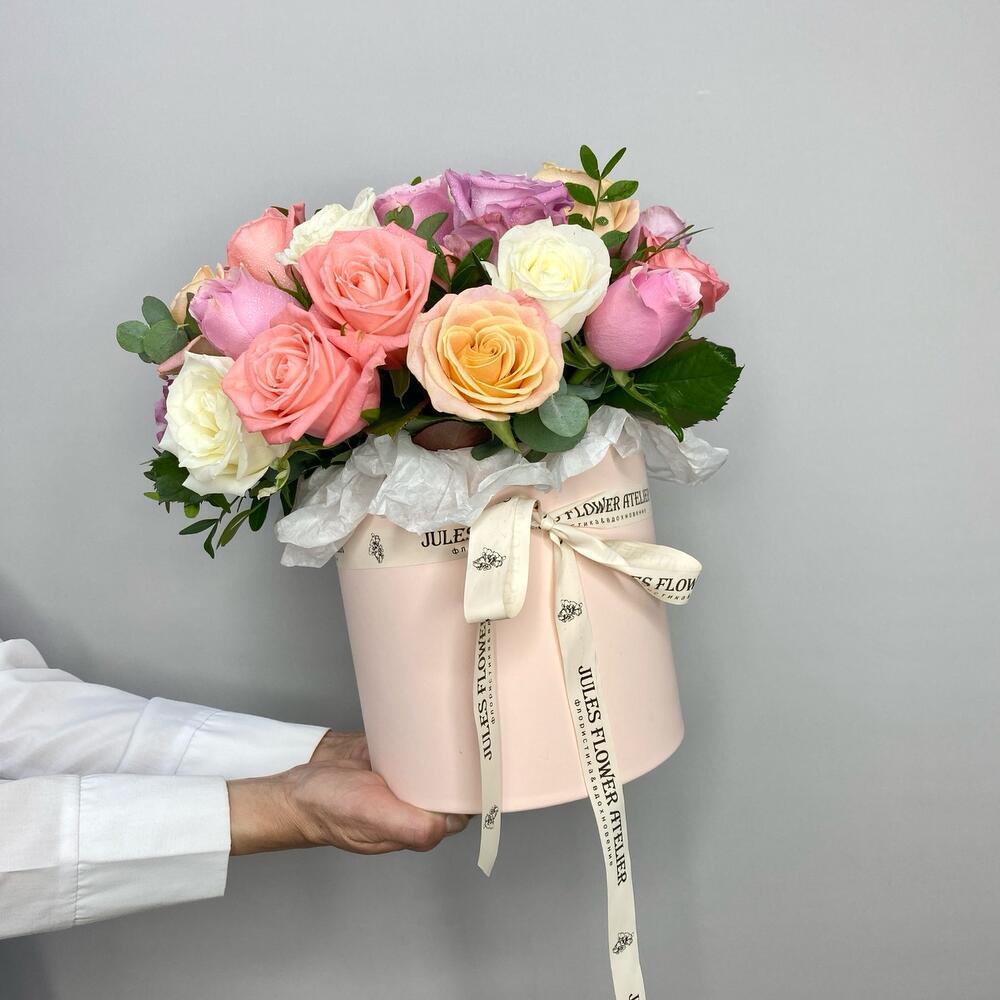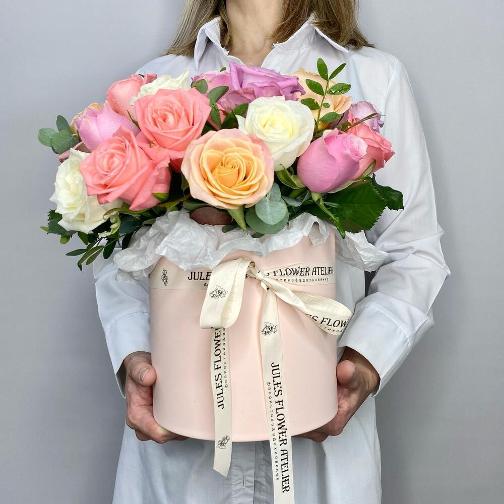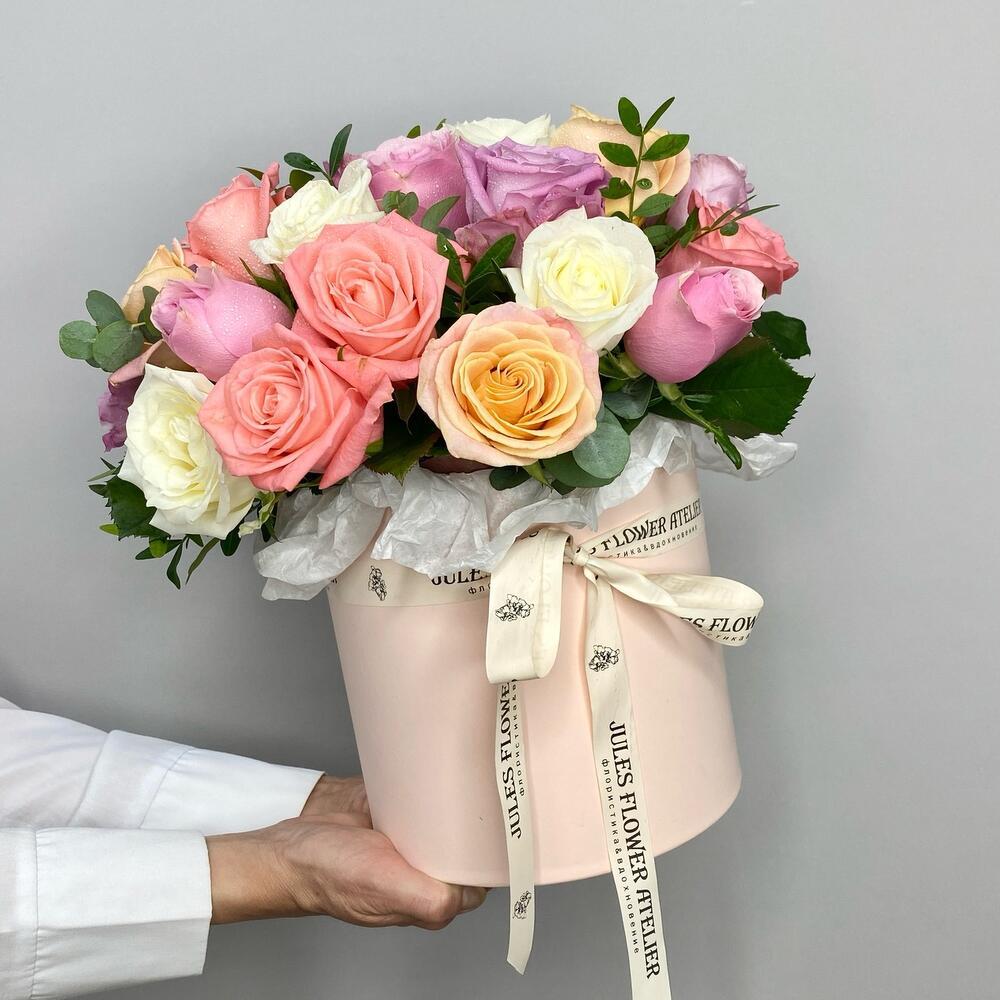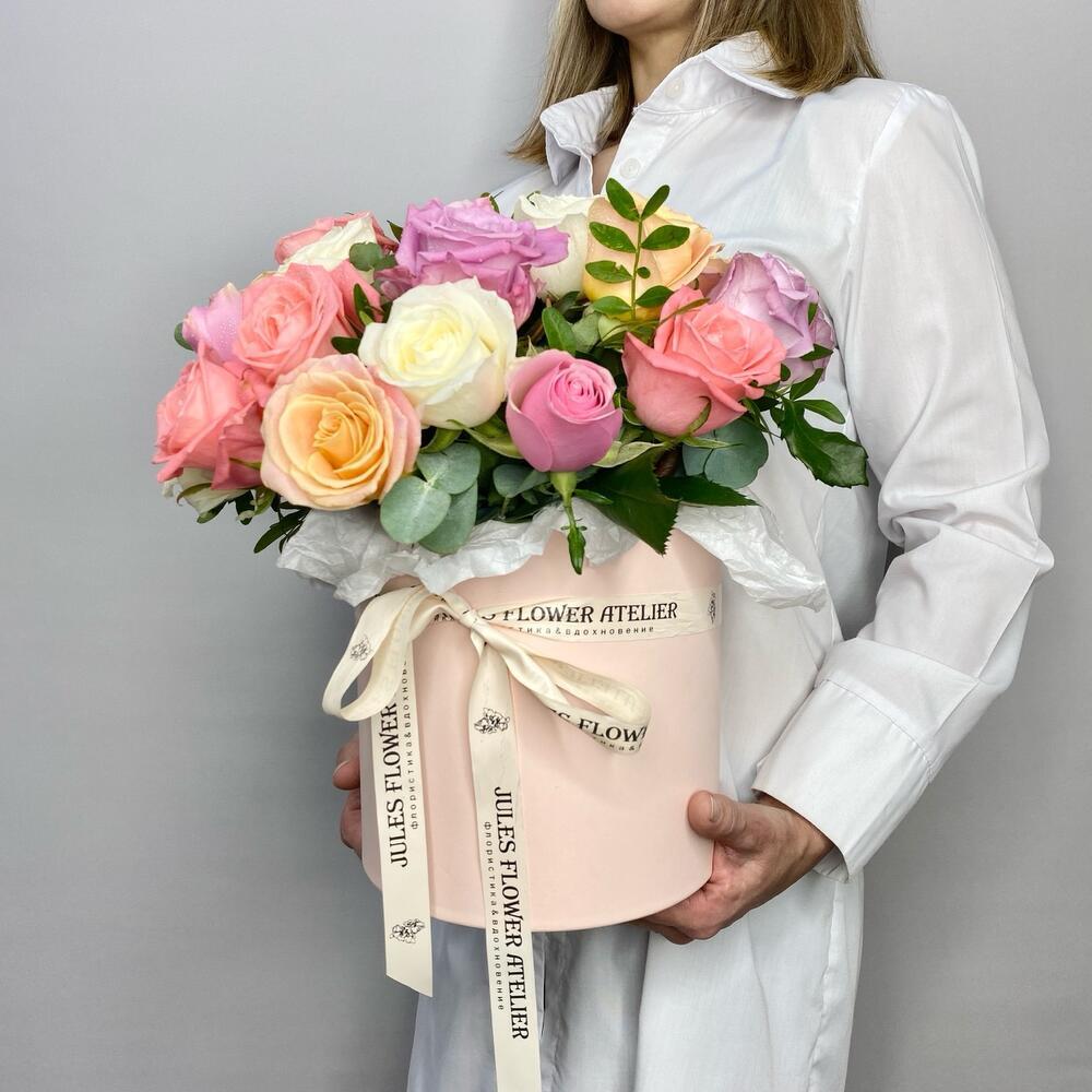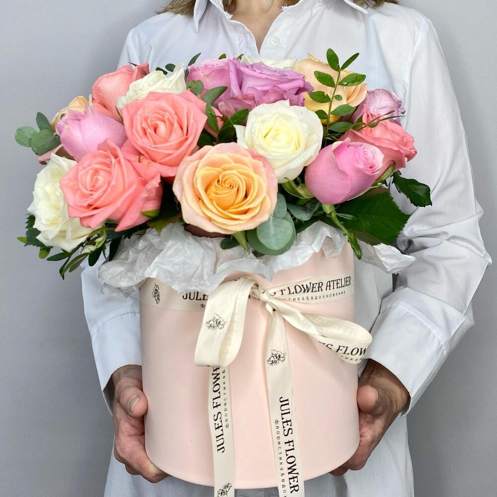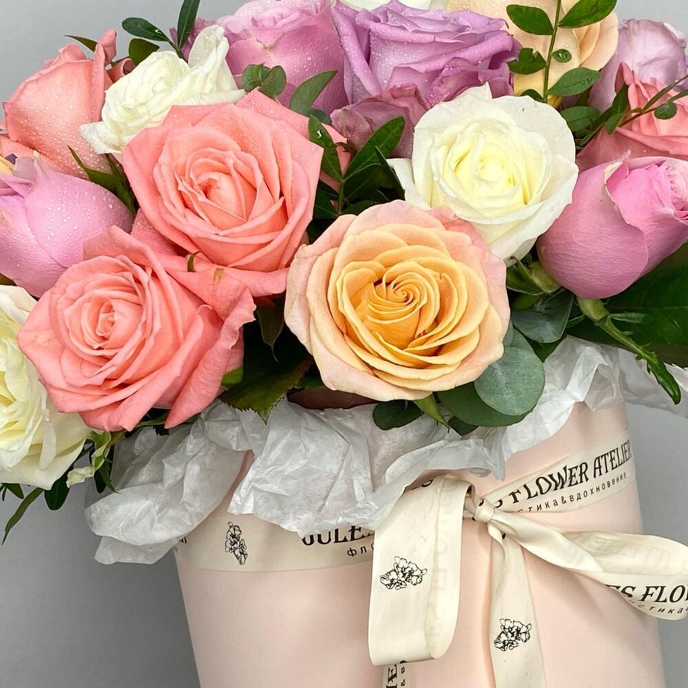 Эвкалипт - 1 шт. Роза - 25 шт. Коробка подарочная - 1 шт. Пистация - 1 шт.