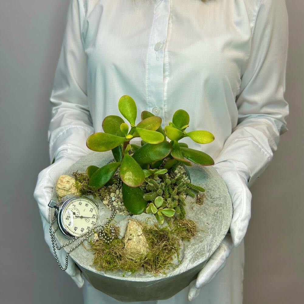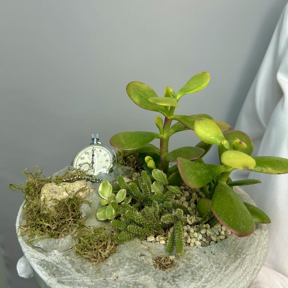 Мини-сад, который напоминает: ты не обязан всё успевать. Пока мир считает секунды, здесь растёт покой. Живые текстуры, мох, суккуленты, камни и старый секундомер — как приглашение нажать «пауза» и просто побыть. Подходит для тех, кто умеет находить красоту в простом, и кто хочет добавить в интерьер кусочек живой философии. Композиция не требует много ухода, но дарит много тишины.