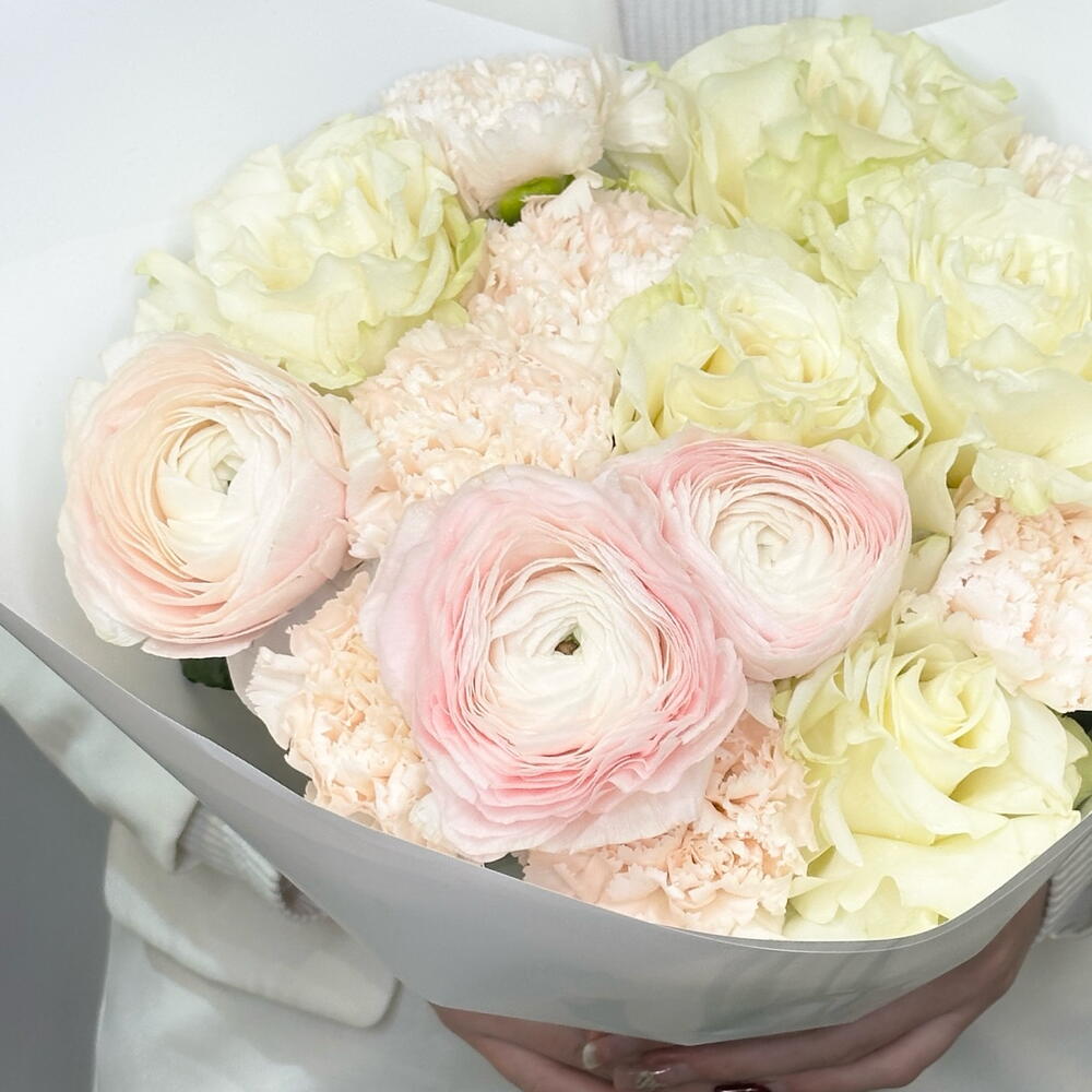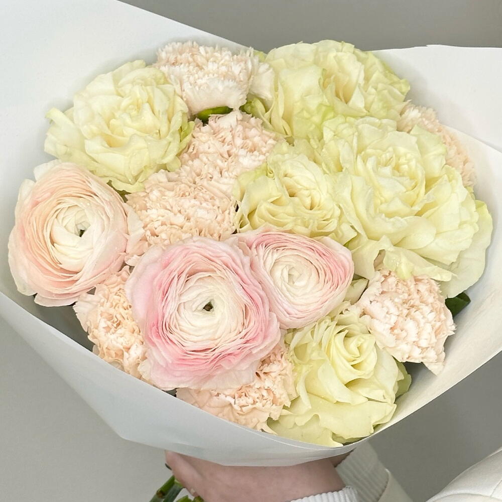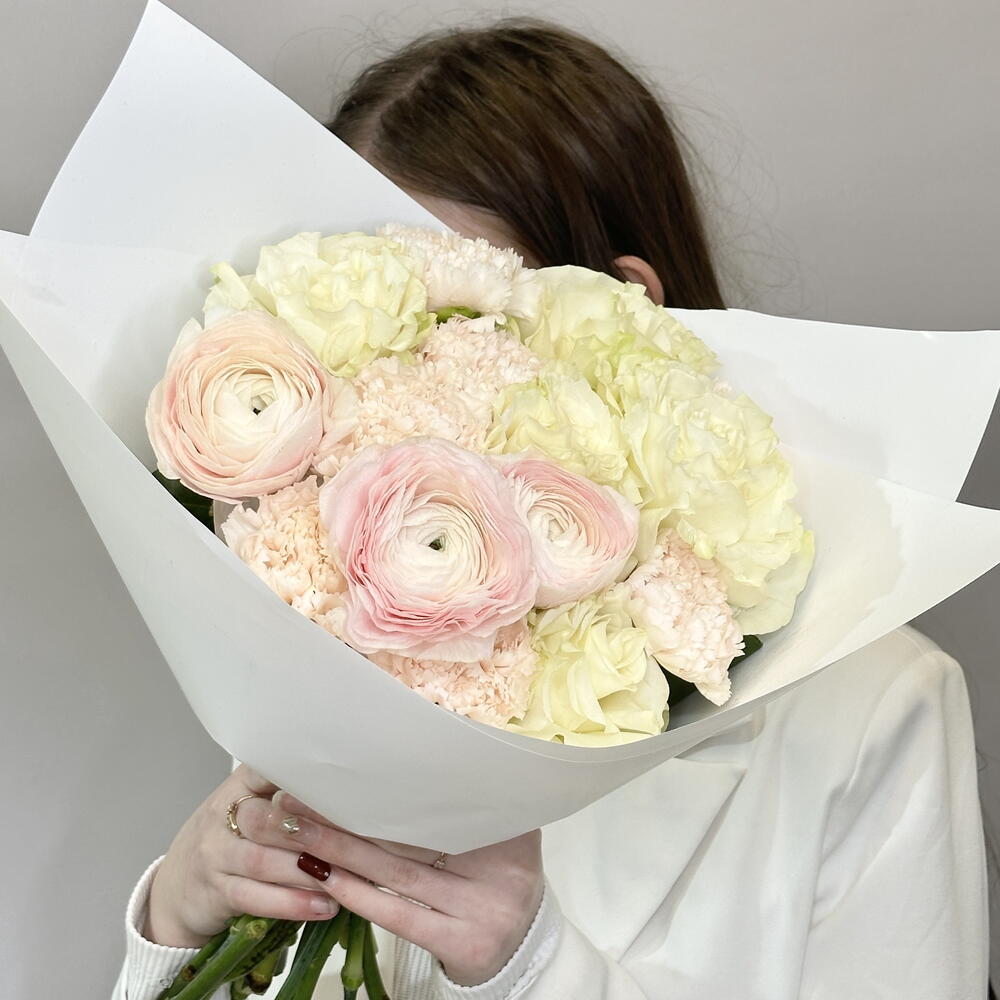 Упаковка дизайнерская - 1 шт. Диантус кремовый - 7 шт. мондиаль - 5 шт. Ранункулус - 3 шт.