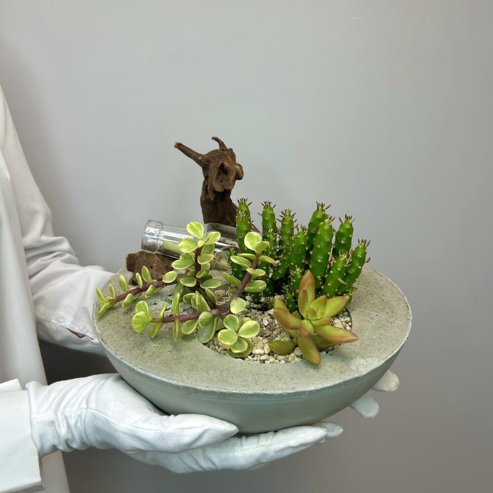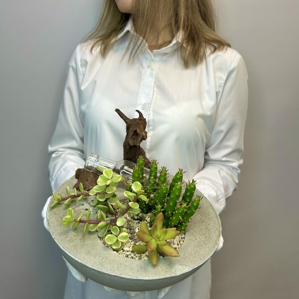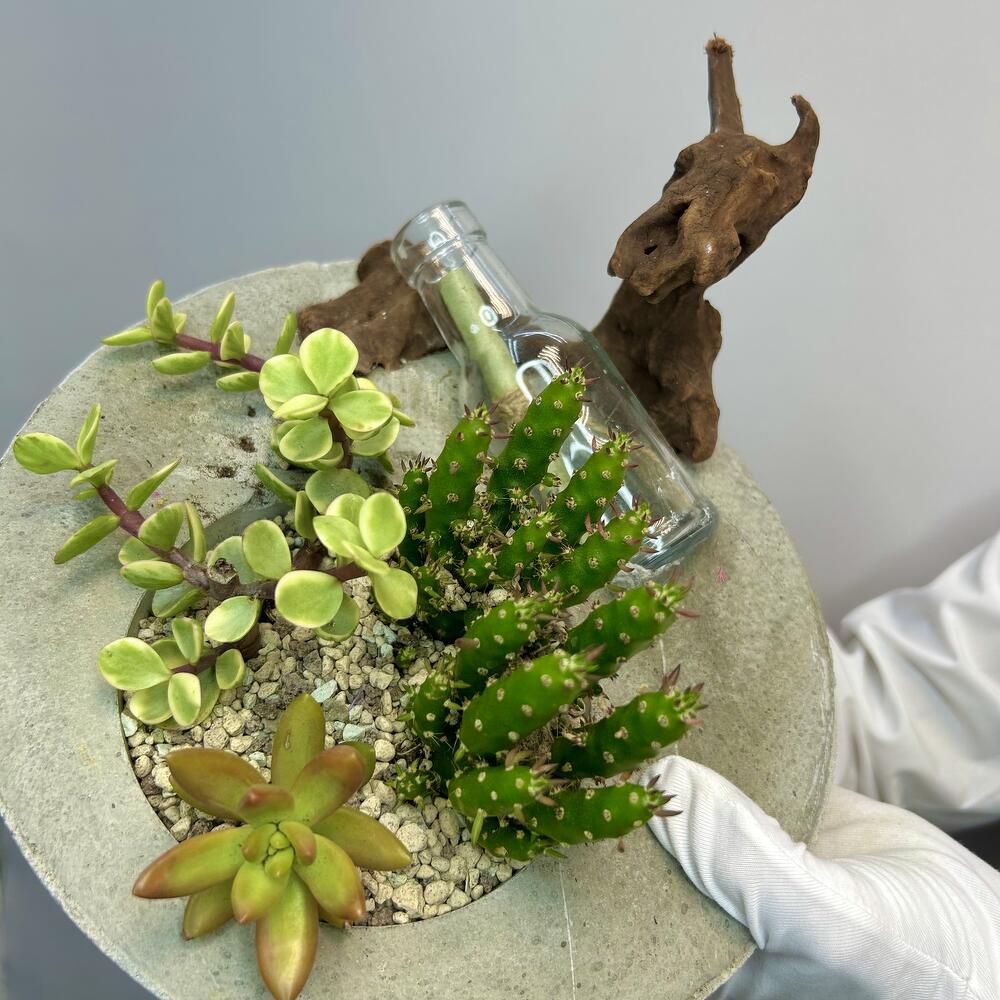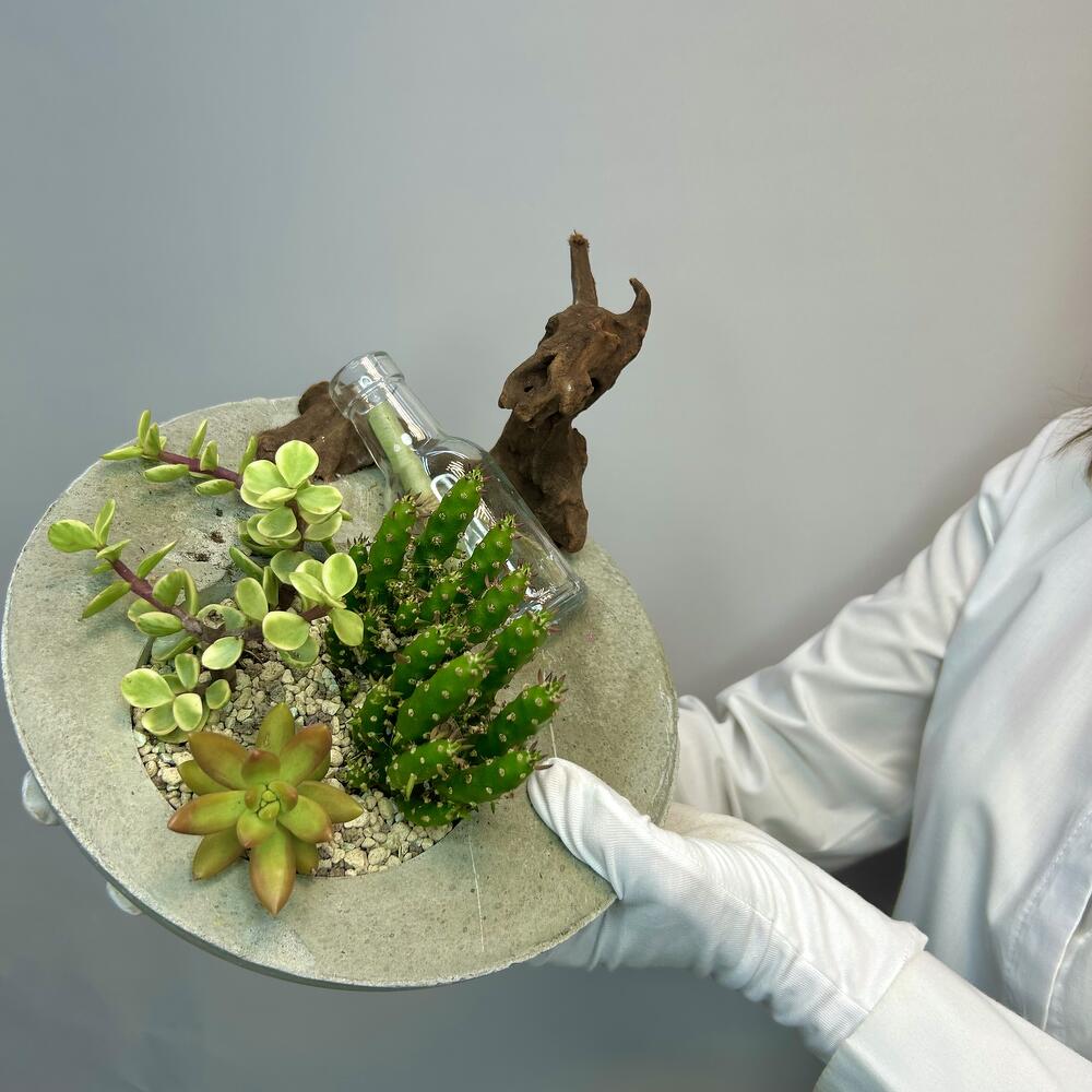 Забытое послание (композиция из суккулентов и коряги) Мини‑остров, где сочные листья соседствуют с колючими стеблями, а в бутылке спрятано ваше личное письмо из далёкого мира. Дрейфующее дерево, словно выброшенное ветром, суккуленты, будто охраняющие тайну, и свёрток в стекле — символ надежды и приключений. Поставьте это послание на видное место и пускай оно напоминает о том, что даже в самых неожиданных местах можно найти жизнь, красоту и смысл.